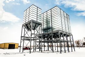 Overhead Bulk Storage bins and modules are typically used for the interim holding of material in a processing system, for example the blending of feed ingredients in the bins and the the blending of fertilizer ingredients in the modules.